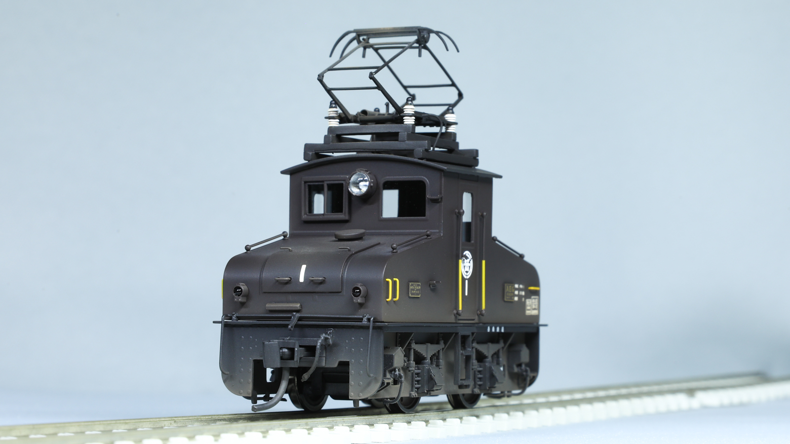 アオバモデル製キットを組み立てたもので、プロトタイプは岳南鉄道デキ1(木製パンタグラフ櫓時代)としました。キットの手順通りに組み立てを進めましたが、実車と照らし合わせると各部のディテールが異なるために修正しました。手すりの塗り分けは木製パンタグラフ時代に準じ、特注の検査標記等のインレタも同様に気を配りました。動力装置は天賞堂のコアレスパワートラックを加工して使用し、満足な走行を得られました。茶系のウェザリング仕上げで重厚感を演出しました。
