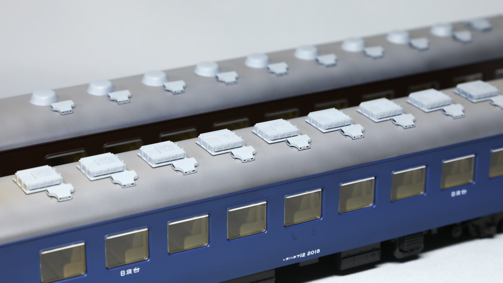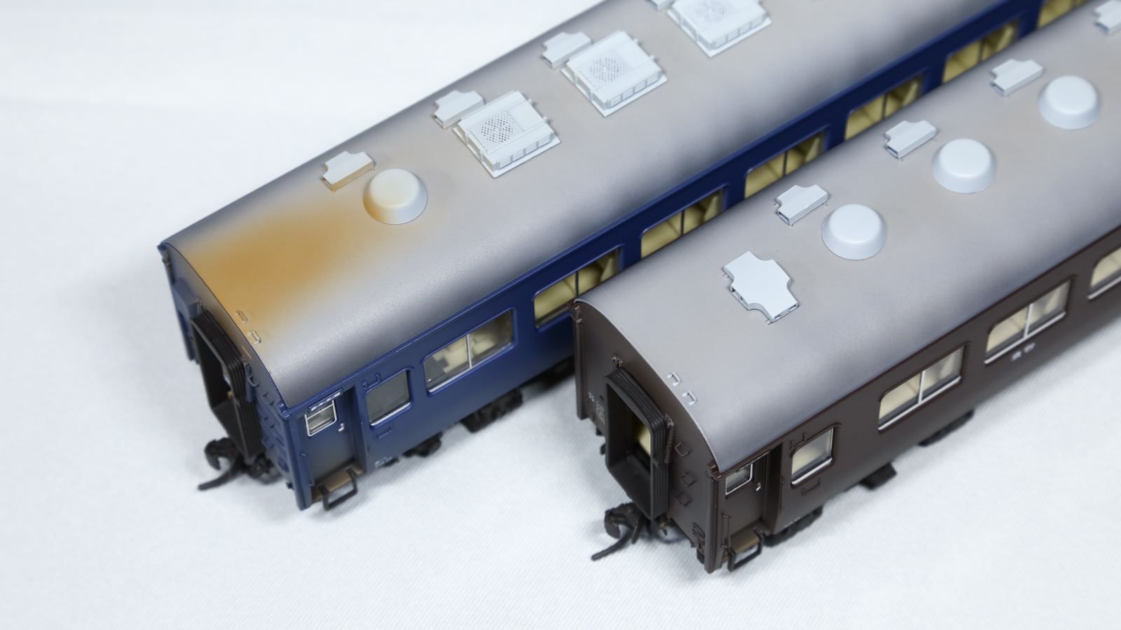 ●(オハネ17・オハネフ12)屋上機器は僅かに青いライトグレーとし、日焼けで色が抜けた状態を再現。