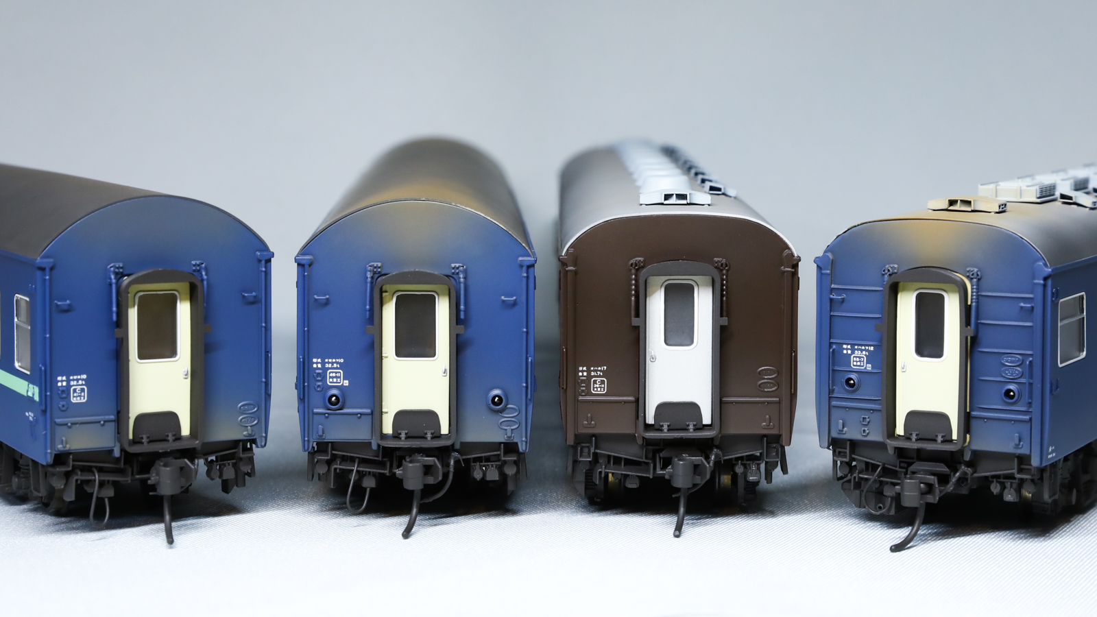 ●(オハネ17・オハネフ12)茶系・黒系の汚れは場所や方向性を意識して追加、オハネフ12は妻面との連続した汚れを再現。