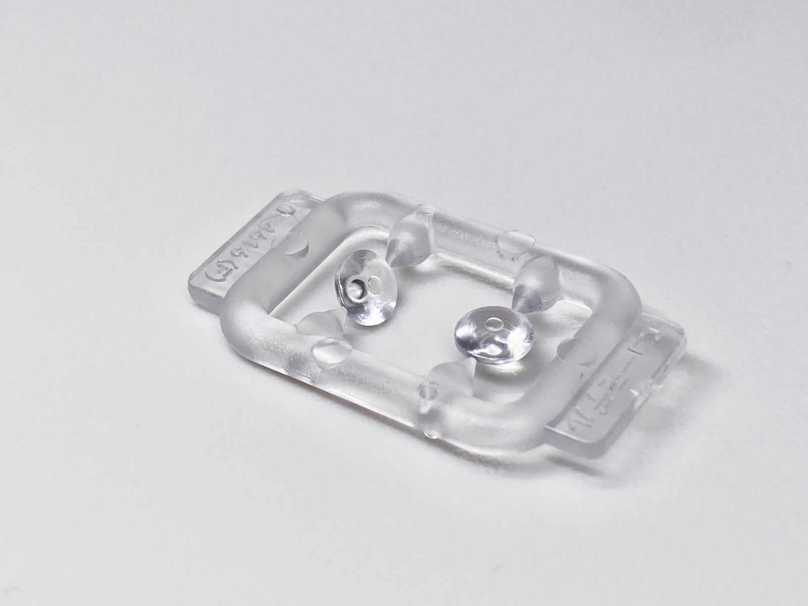 接着剤2に対し水1を加えて薄め、それを楊枝や針先により、前照灯パーツのレンズ取付部に少量塗り、レンズを嵌めます。この時、カット付きのタイプでは曲がらないように、十分注意が必要です。はみ出た接着剤は生乾きの内に、楊枝で巻取って除去します。