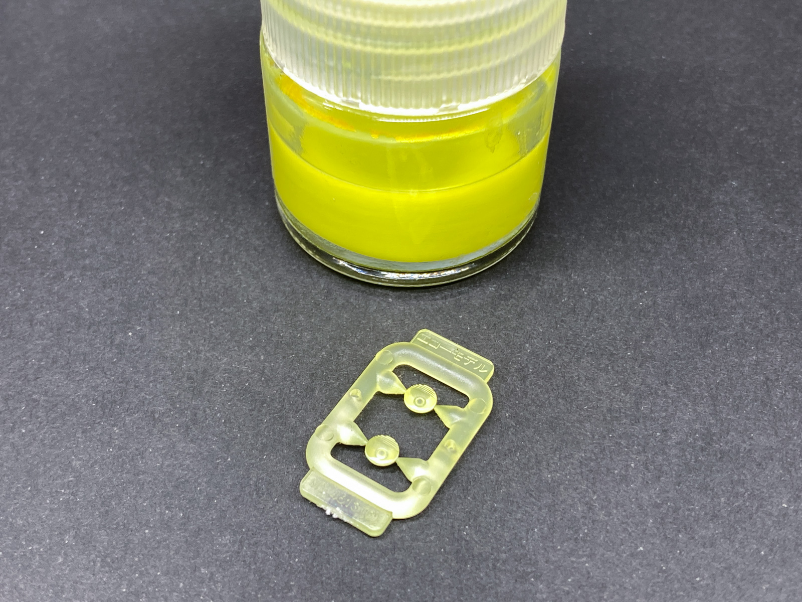 ③塗料皿などにラッカーシンナーを必要量入れ、ベースフィルムに付いたままのパーツを入れます。フィルムから無理にはがすと、変形して使用できなくなりますので、絶対にお止めください。