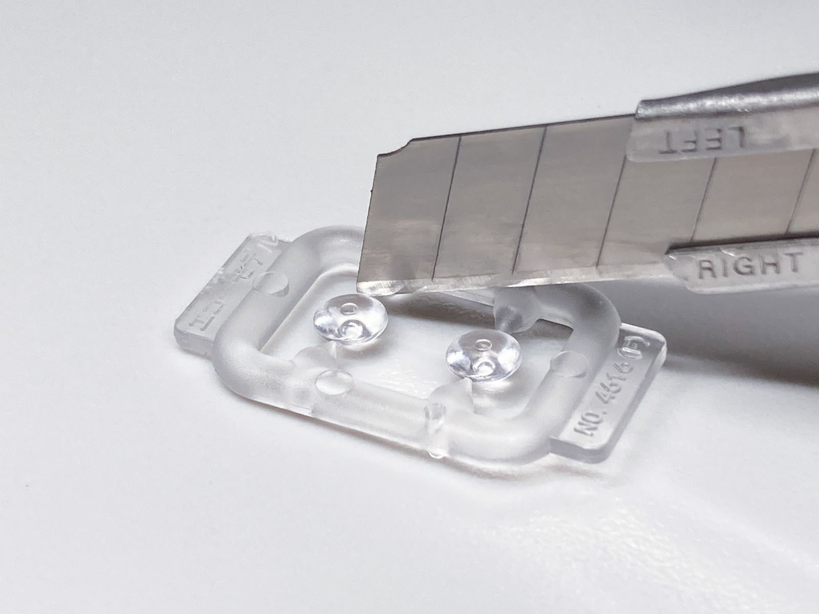 理想的には高価なプラ用ニッパーがお勧めです(一般的なニッパーは不可)。無ければカッターを使用して、表側から切り出しますが、この場合は飛ばさないように注意が必要です。