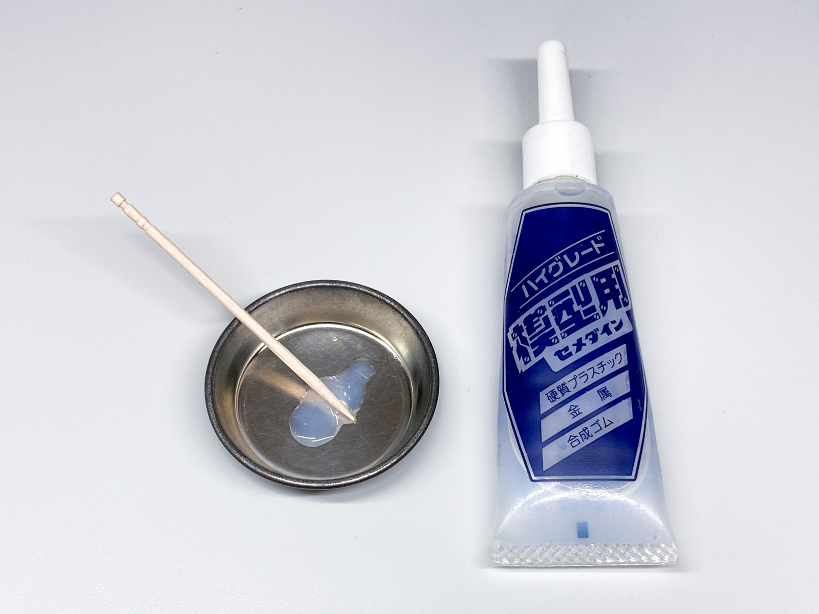推奨する接着剤は「ハイグレード模型用セメダイン」です。水溶性でクリアパーツが曇らないのが特徴です。