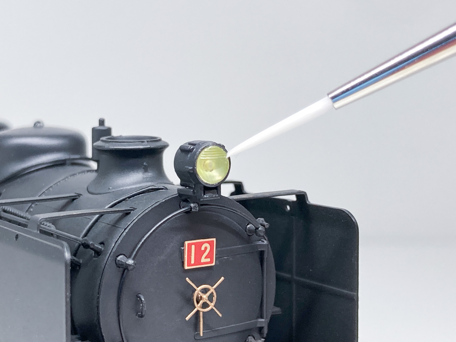 100W(150W)のLP42等のレンズは蒸機、電機、旧国の他小田急等でも使われ、これらの中にはゴールデングローに代表される黄緑色をした物が存在します。この再現にはクリアイエローとクリアグリーンを調色して表現すると良いでしょう。いずれの作業の時も、表側をマスキングゾルで保護しておいた方がよいでしょう。