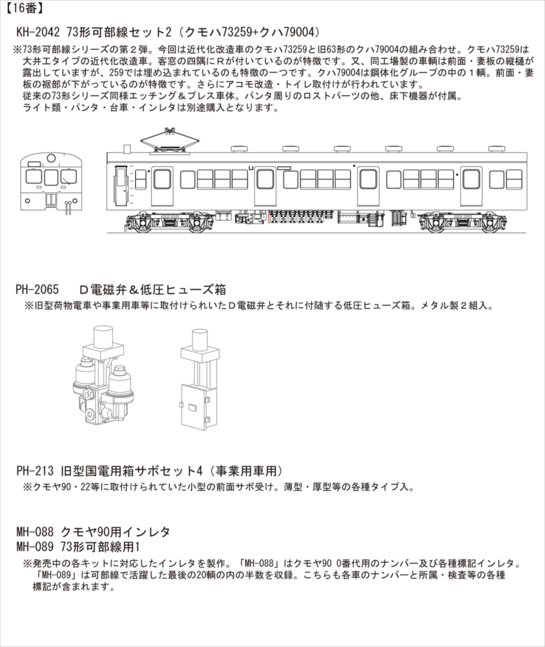 | BONA FIDE PRODUCT | KH-2042 73形可部線セット2(クモハ73259+クハ79004)キット (詳細はこちら) | ¥49,000 |