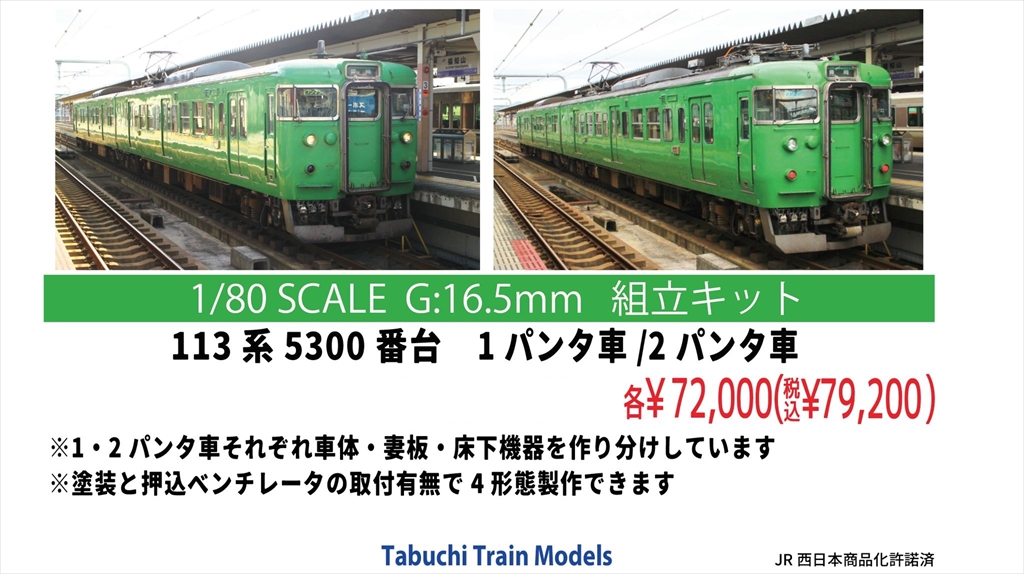 | Tabuchi Train Models | 113系3800番台 1パンタ車 組立キット (詳細はこちら)、(関連パーツ) | ¥68,000 |