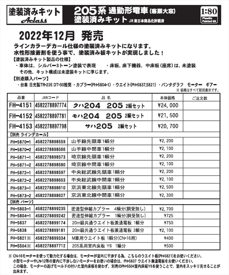 | 〃 | FH-4152 205系 (客扉大窓) モハ204・205 2輌セット (塗装済みキット) | ¥21,500 |