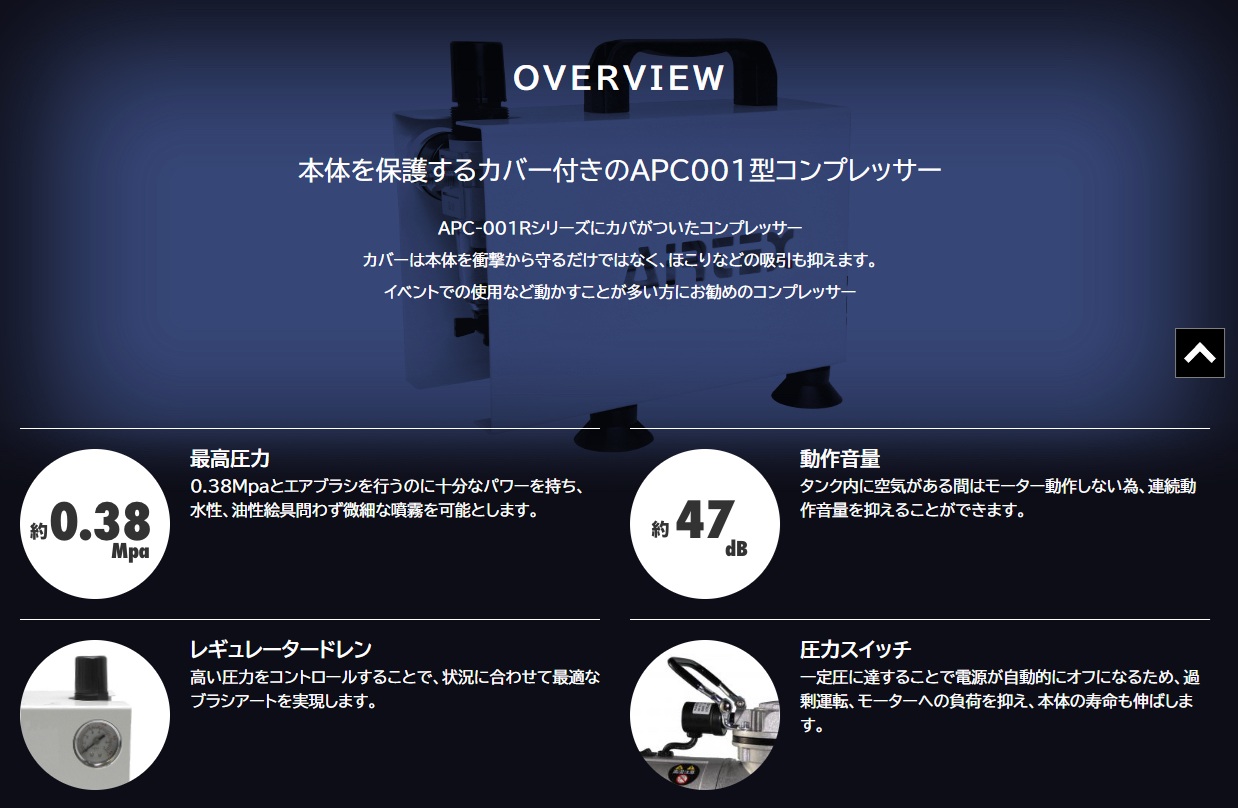 気軽にエアーブラシ塗装が楽しめるコンパクトサイズのコンプレッサーです。ちょっとした塗装や細かな迷彩などに使える吐出量を確保。電源は家庭用の100Vコンセントを使用。1/8inchサイズのエアブラシに接続してそのまま使えます。