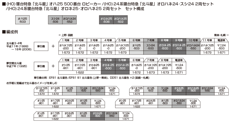 | HO-9131 | JR 24系25形特急寝台客車(北斗星・JR東日本仕様)基本セット | ¥53,820 | 2026年5月 |