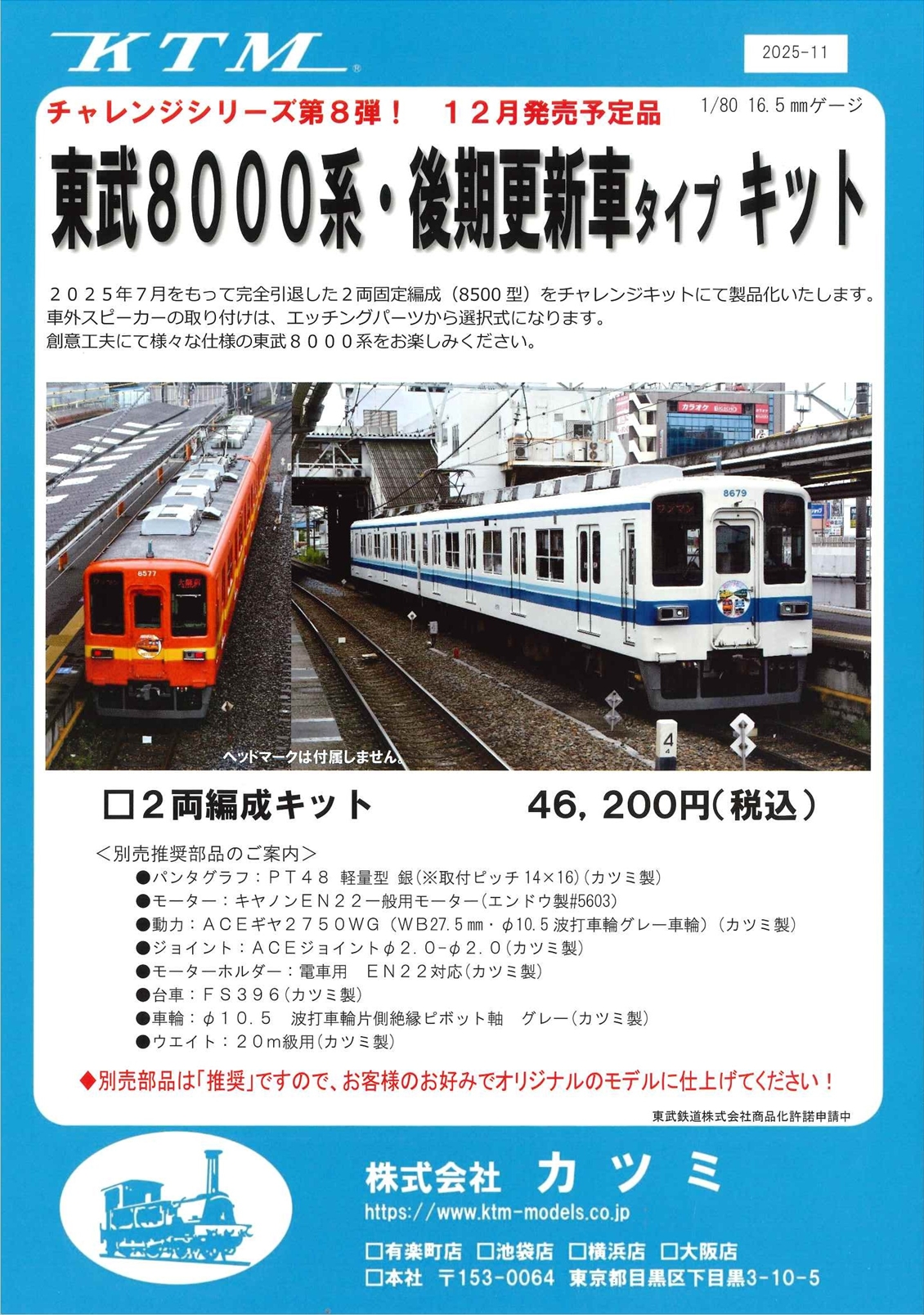 | 東武8000系 後期更新車タイプ 2両編成 キット | ¥42,000 | 2025年12月 |