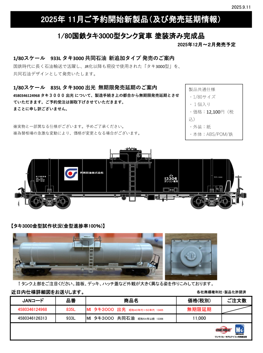 | 937L | MI タキ3000 米タンVer.2 昭和中期 6種類番号 | ¥65,000 | 2025年12月~2月 |
