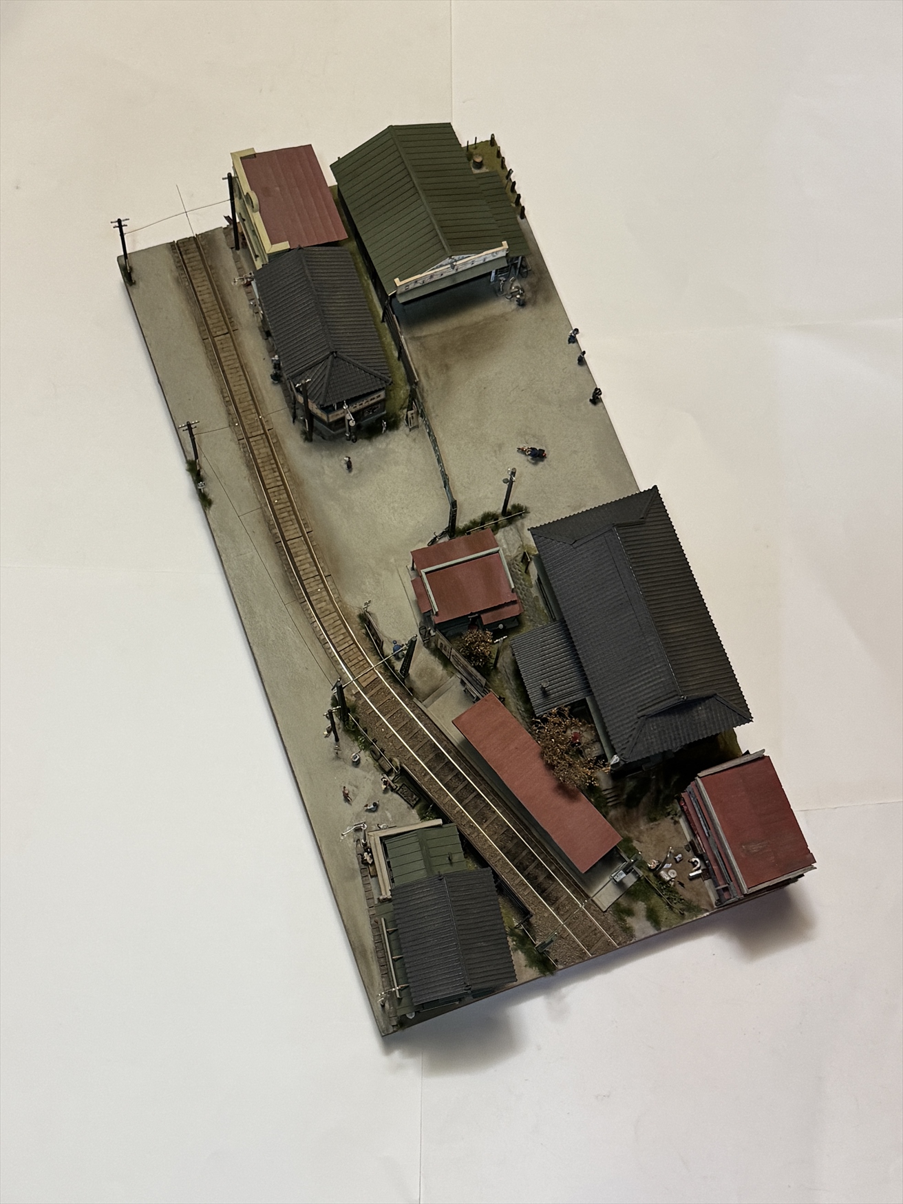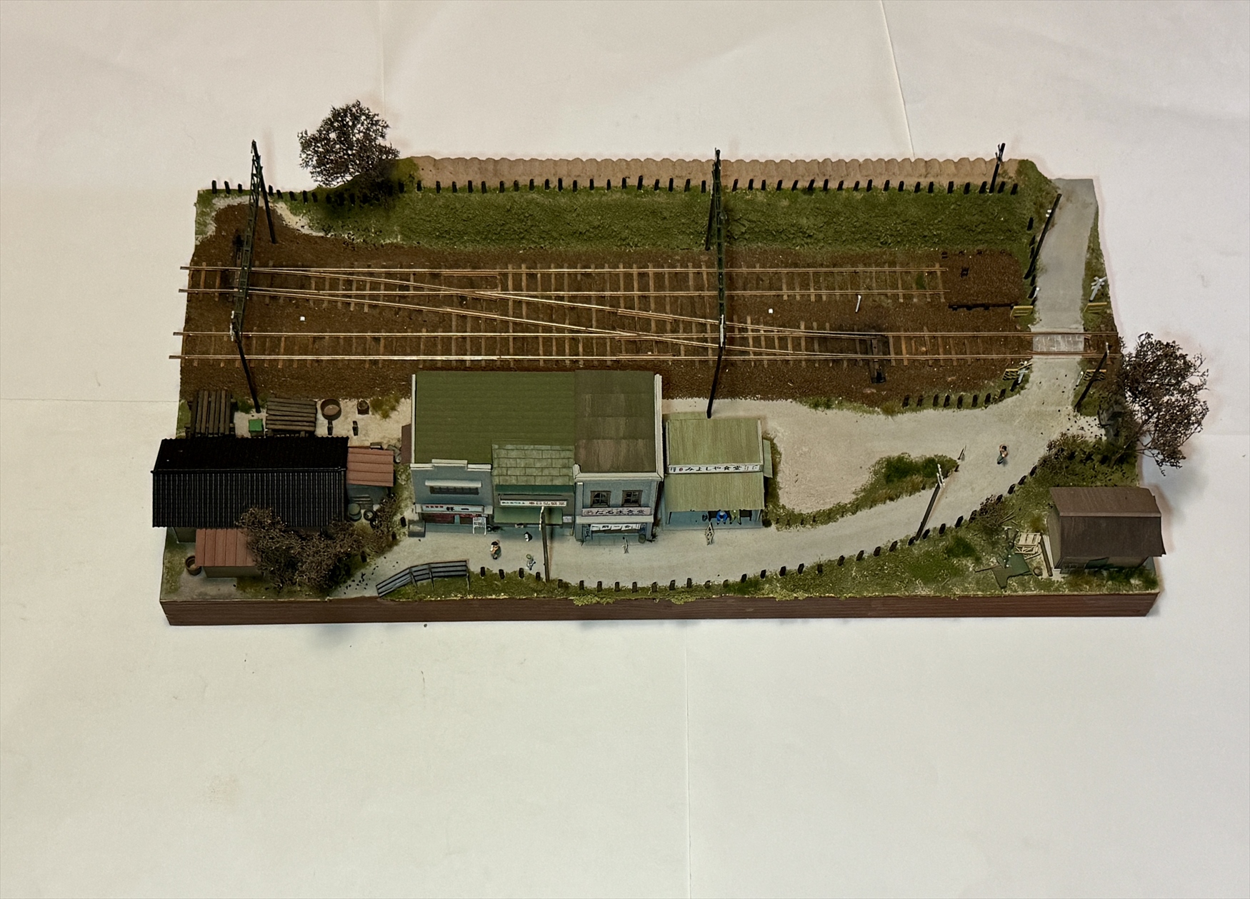 左セクションは駅風景です。駅舎はエムズコレクションで発売する予定の駅舎を私が設計し、その試作及び製品の完成見本として製作したもので、駅舎以外のストラクチャー類は全てフルスクラッチです。右セクションは奥の鉄道線の構内本線集束部分を再現したもので、ストラクチャーは少なめです。左セクションにはLEDの照明が組み込まれており、ベース裏側にある単3電池で動作します。