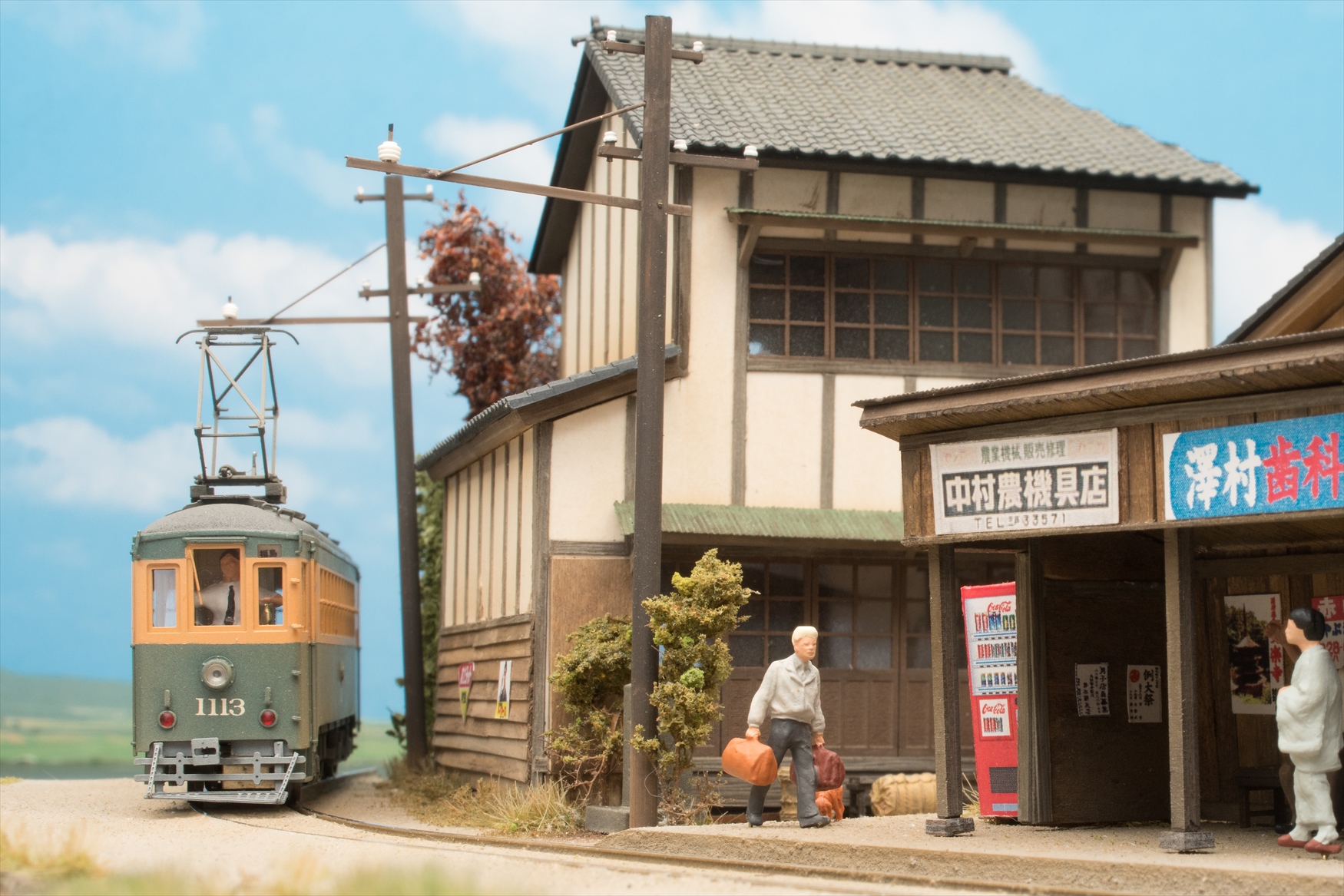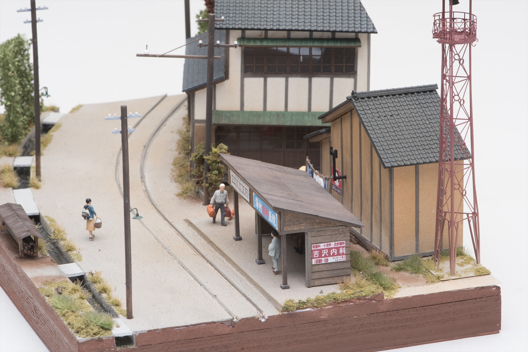福島交通軌道線の保原までの街並みを行く区間にある駅風景と併用軌道の風景を再現したものですが、特定の駅を再現したものではなく、沿線風景の良い所と気になった駅を組み合わせて製作しています。奥行きが浅く書割になっています。