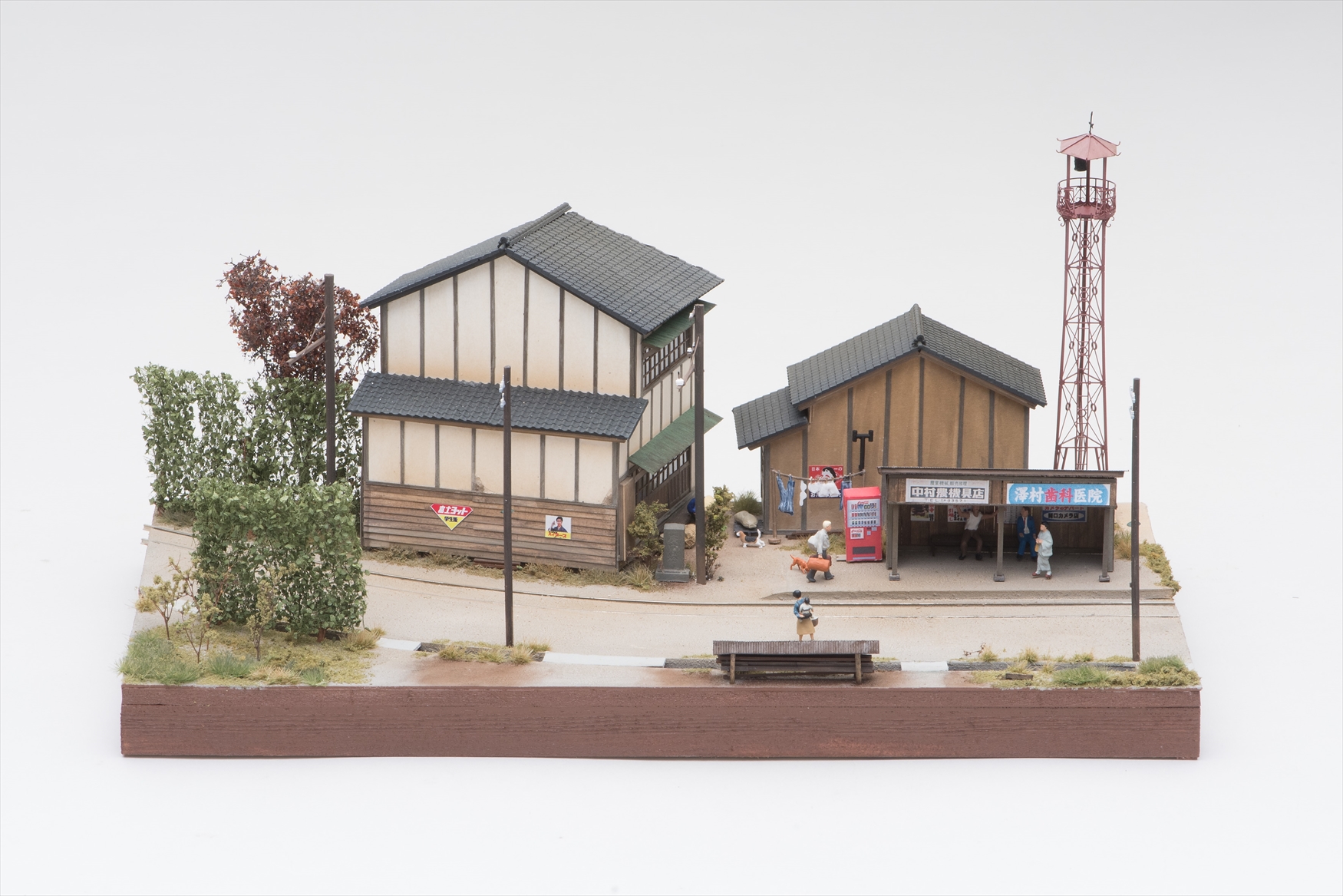 ストラクチャーはフルスクラッチ、キット組の火の見櫓が付属します。別ジオラマの神社のある風景と組み合わせてRMM誌に掲載しました。