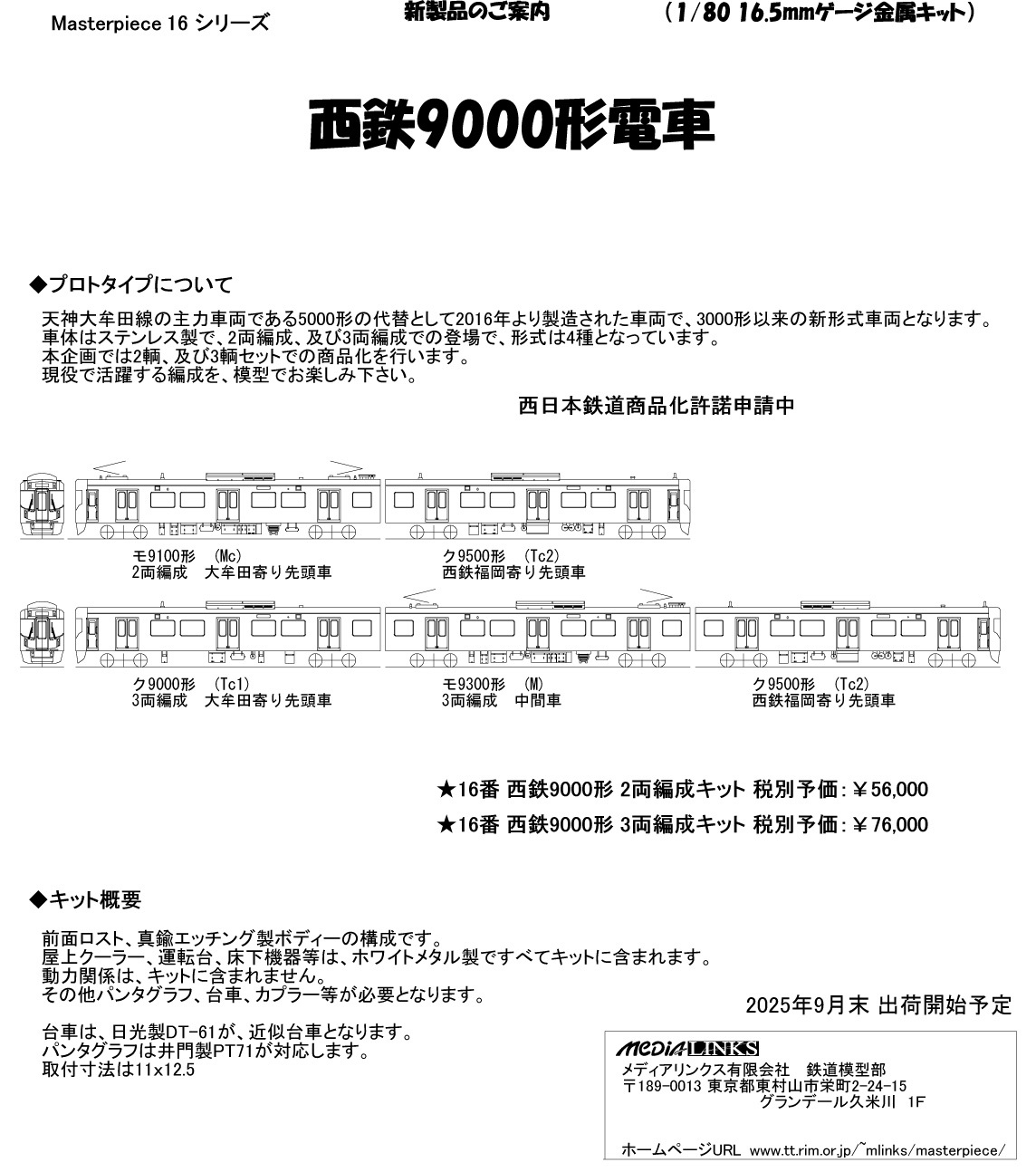 | マスターピース | 16番 西鉄9000系 2両編成キット (詳細はこちら)、(編成図) | ¥56,000 |