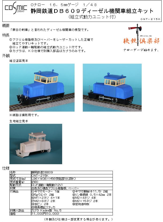 | コスミック | Oナロー 静岡鉄道DB609 ディーゼル機関車 組立キット (組立式動力ユニット付) | ¥10,000 |