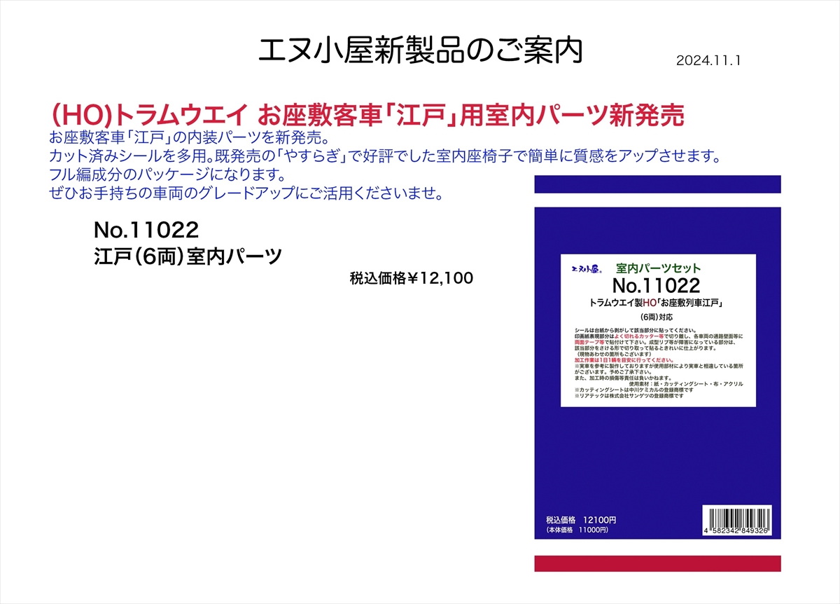 | エヌ小屋 | 11022 トラムウェイ製(HO)「お座敷列車江戸」(6両) 室内パーツセット | ¥11,000 |