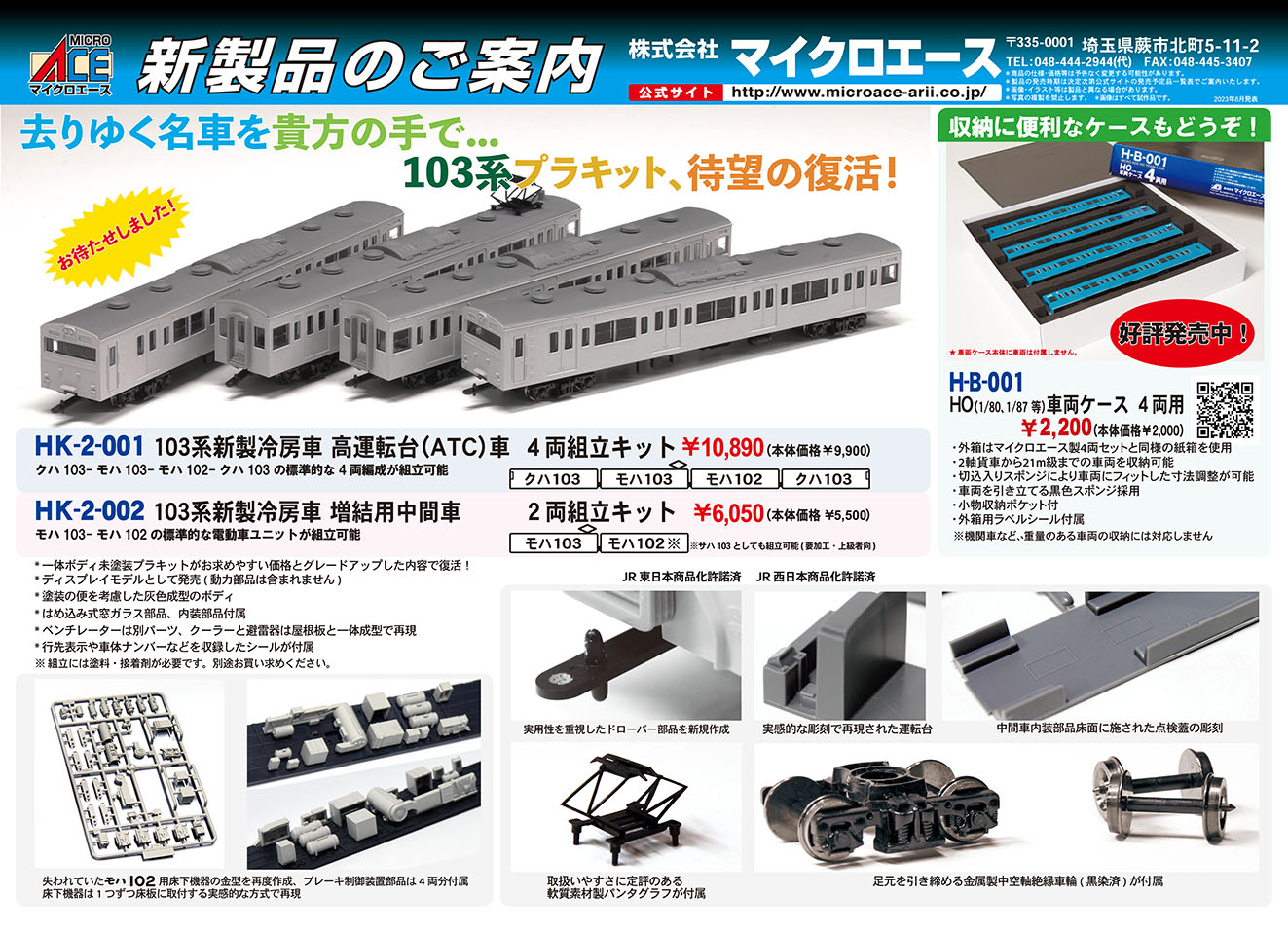 | マイクロエース | 1/80 HO HK-2-001 (詳細ポスター)、(製品詳細) 103系 新製冷房車 高運転台(ATC車)4両組立キット | ¥7,920 |