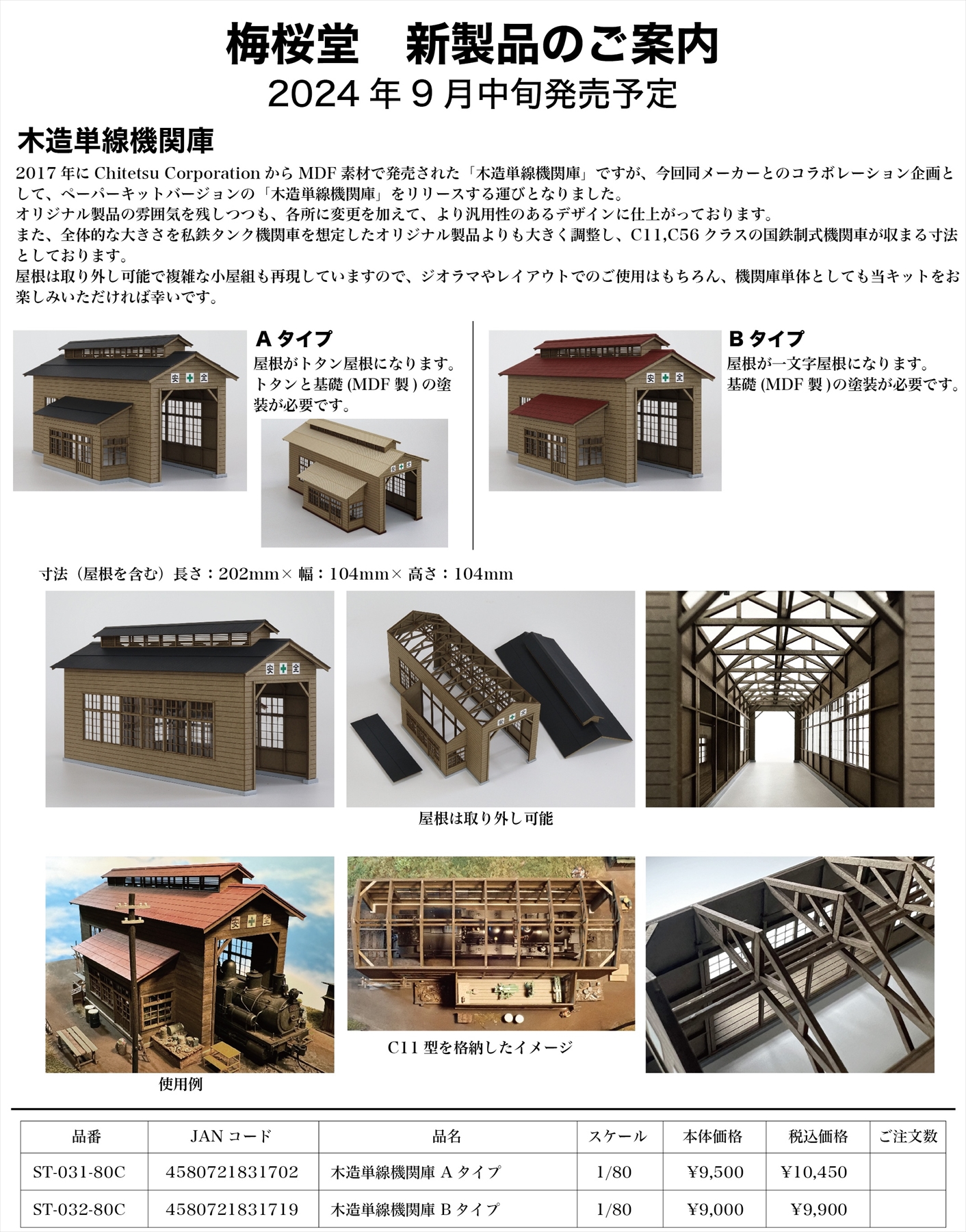 | 梅桜堂/Chitetsu Corporation | 木造単線機関庫Aタイプ トタン屋根Ver.(1/80) ペーパーキット (詳細はこちら) | ¥9,500 |