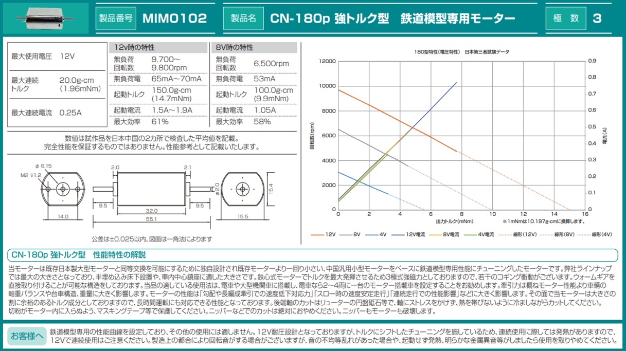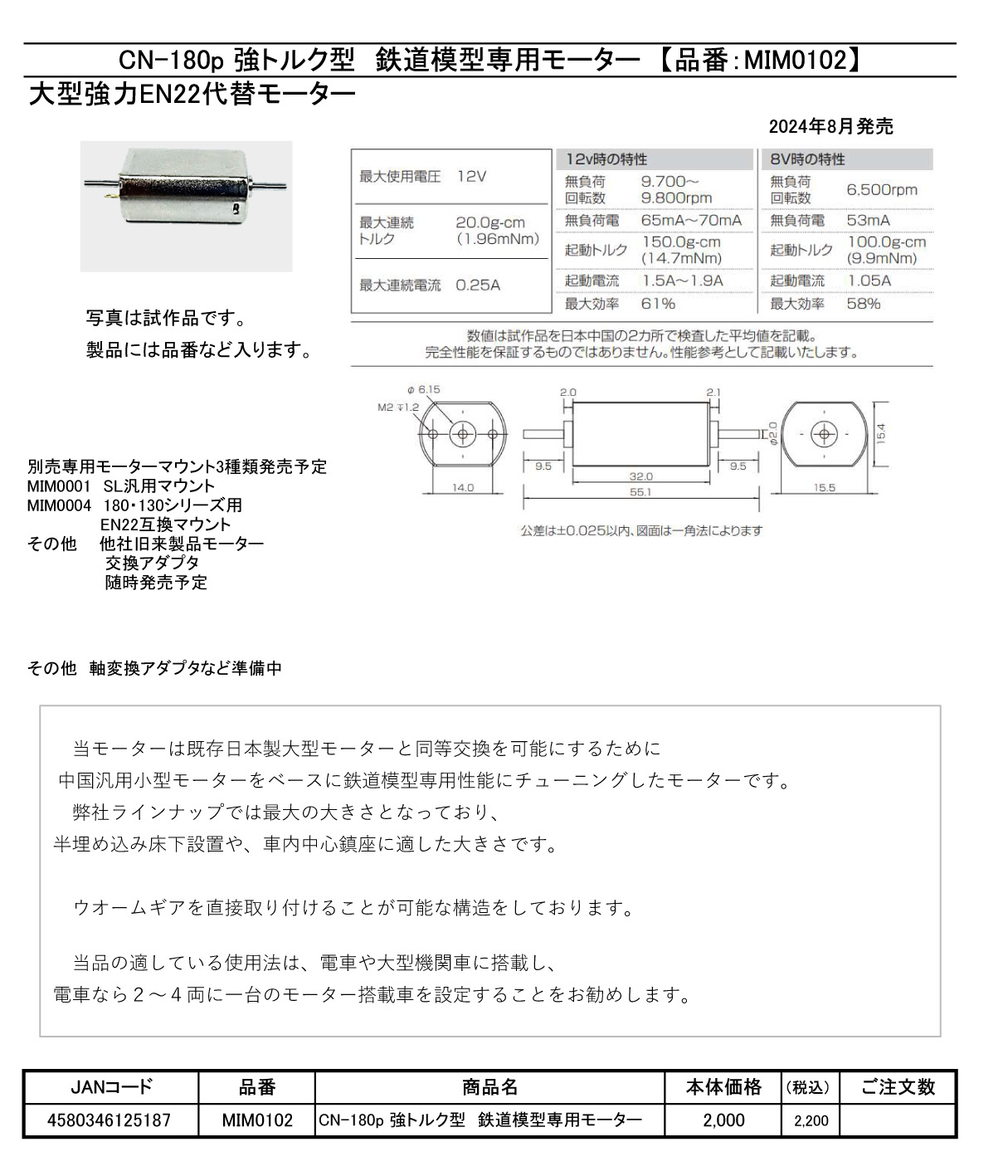 | 〃 | MIM0102 CN-180p 強力トルク型 鉄道模型専用モーター (詳細1),(詳細2) | ¥2,000 |