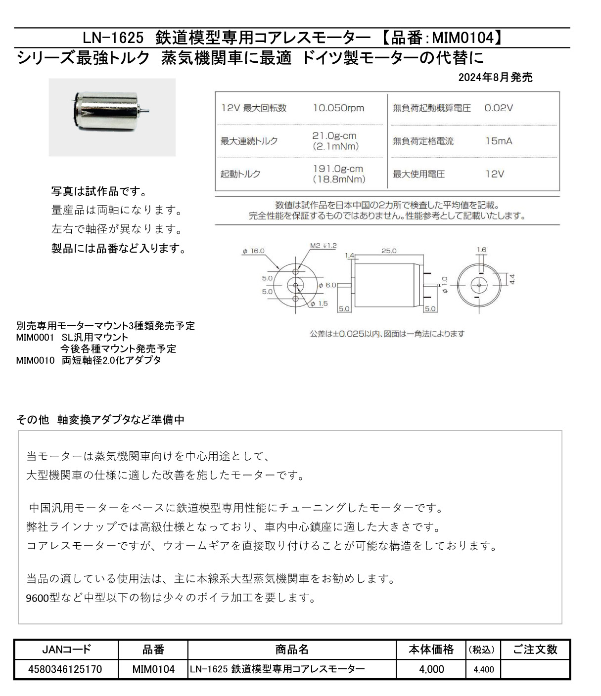 | モデルアイコン | MIM0104 LN-1625 鉄道模型専用コアレスモーター (詳細1),(詳細2) | ¥4,000 |