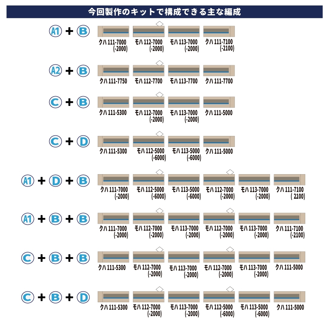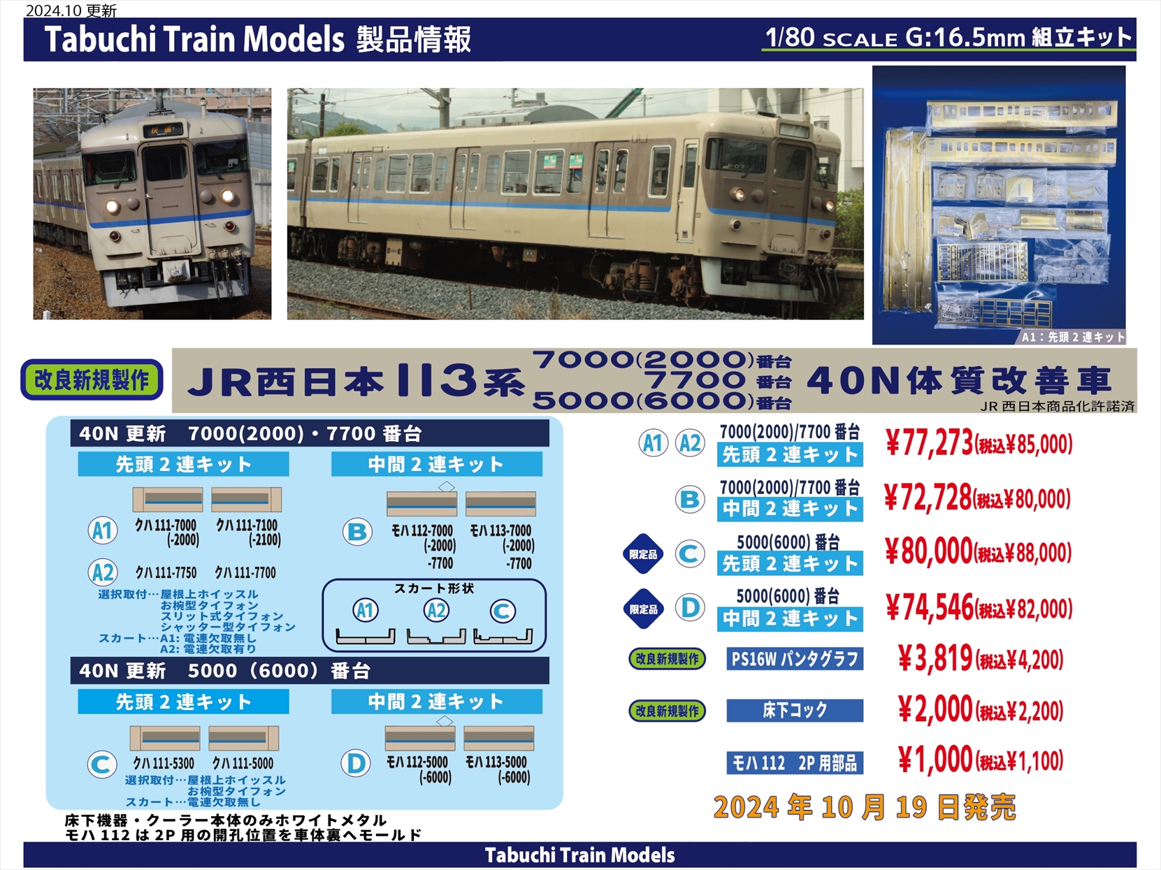 | Tabuchi Train Models | JR西日本 113系40N体質改善車 7000番台 先頭2連 組立キット (製品情報) (キット構成) (OPパーツ) (編成例) | ¥77,273 |