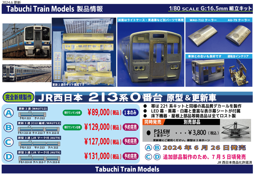 | Tabuchi Train Models | JR西日本 213系0番台 更新2連 組立キット (詳細はこちら) | ¥80,809 |