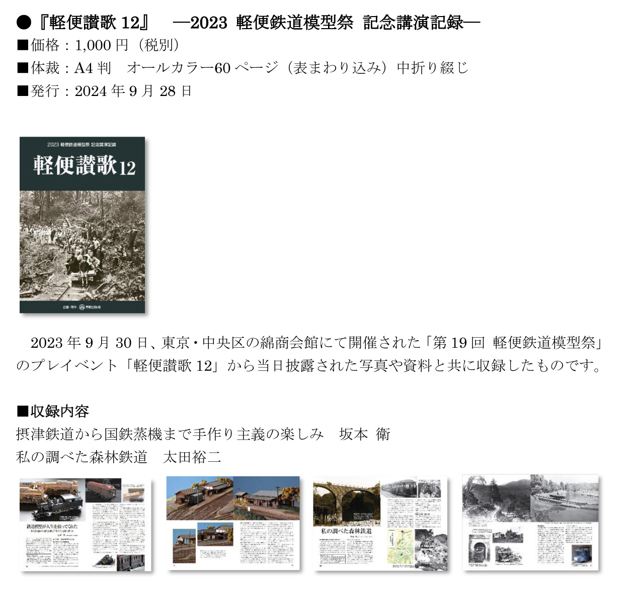 | 南軽出版局 | 『軽便讃歌12』 ―2023 軽便鉄道模型祭 記念講演記録― (詳細はこちら) | ¥1,000 |
