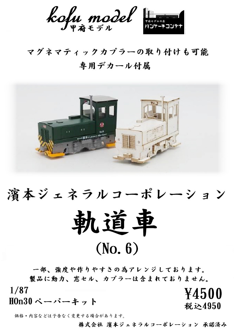 | 甲府モデル | 1/87 HOn 濱本ジェネラルコーポレーション 軌道車(No.6) ペーパーキット | ¥4,500 |
