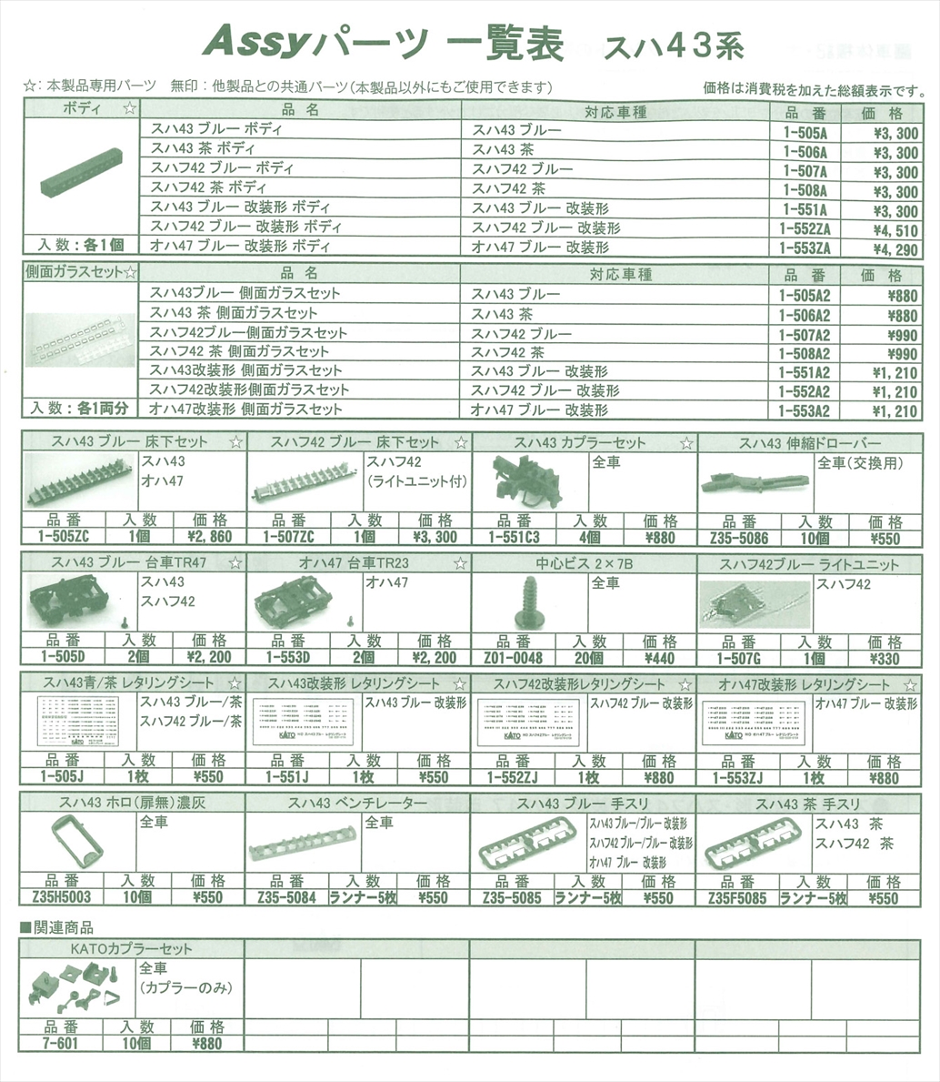 2025.7.27 スハ43 茶/スハフ42 茶 ASSYパーツ各種 追加しました (リストはこちら)
